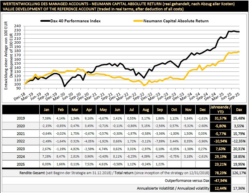 Unsere real gehandelte Portfoliostrategie „NEUMANN CAPITAL ABSOLUTE RETURN" (Managed Account auf eigene Rechnung) hat mehrere Alleinstellungsmerkmale.