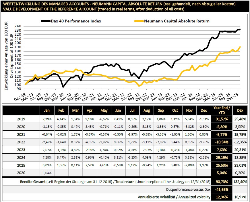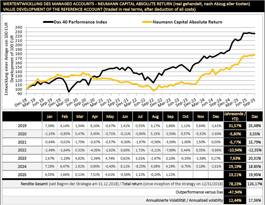 Our proprietary developed and real traded equity-oriented portfolio strategy „NEUMANN CAPITAL ABSOLUTE RETURN" has several unique features.